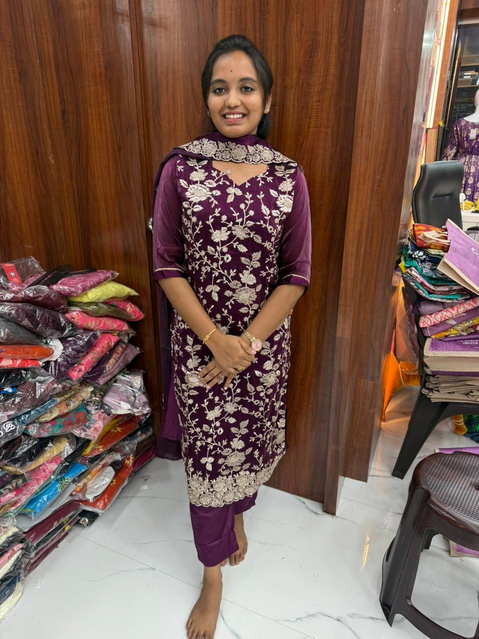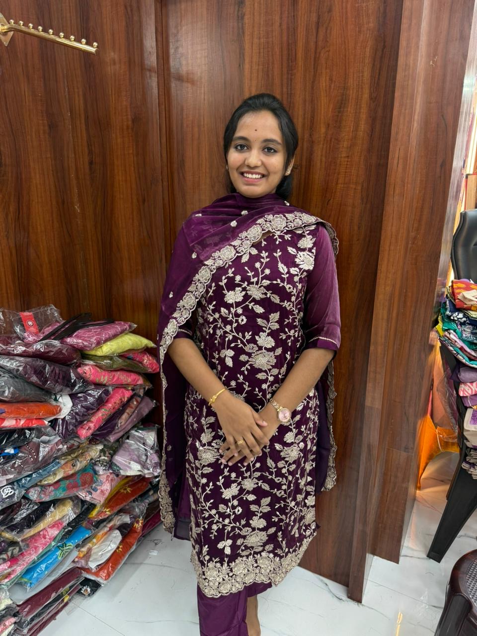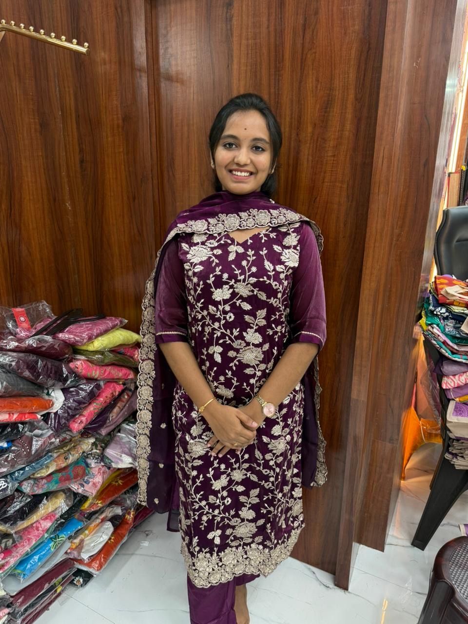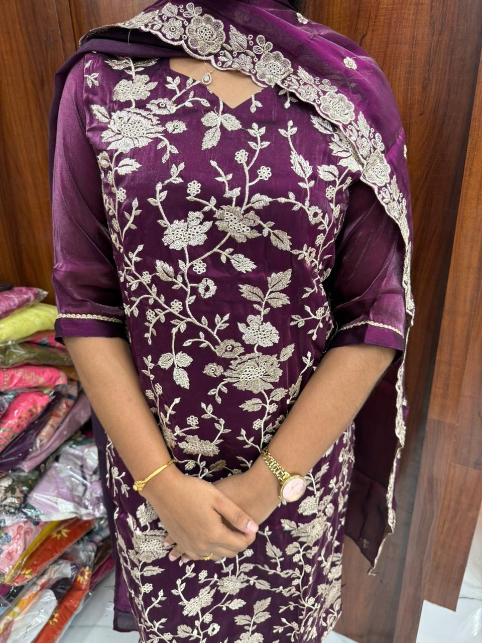 Printed Organza Wine Embroidery Set Premium Party wear
