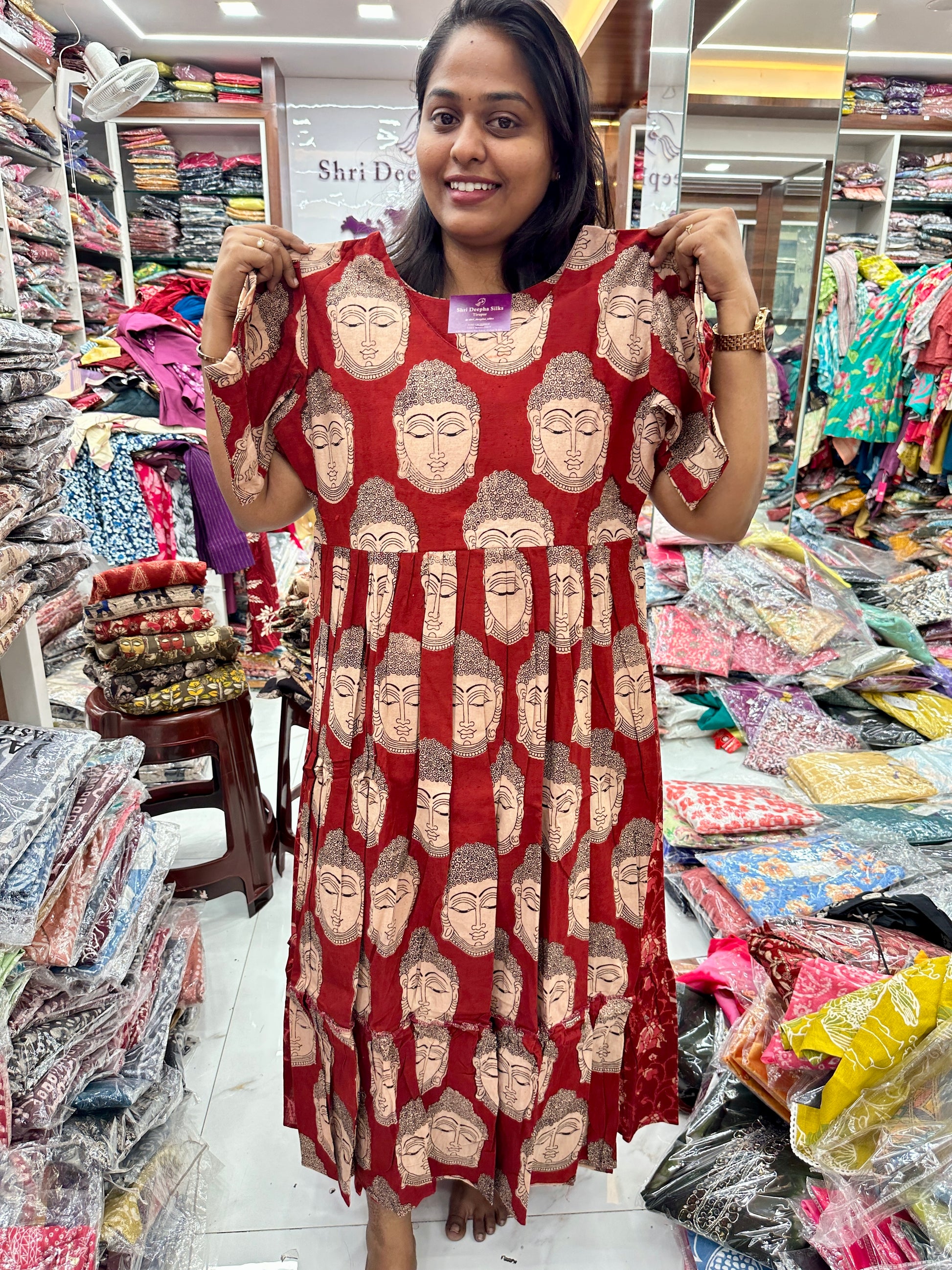 Kalamkari Cotton Puff Midi - Red Buddha