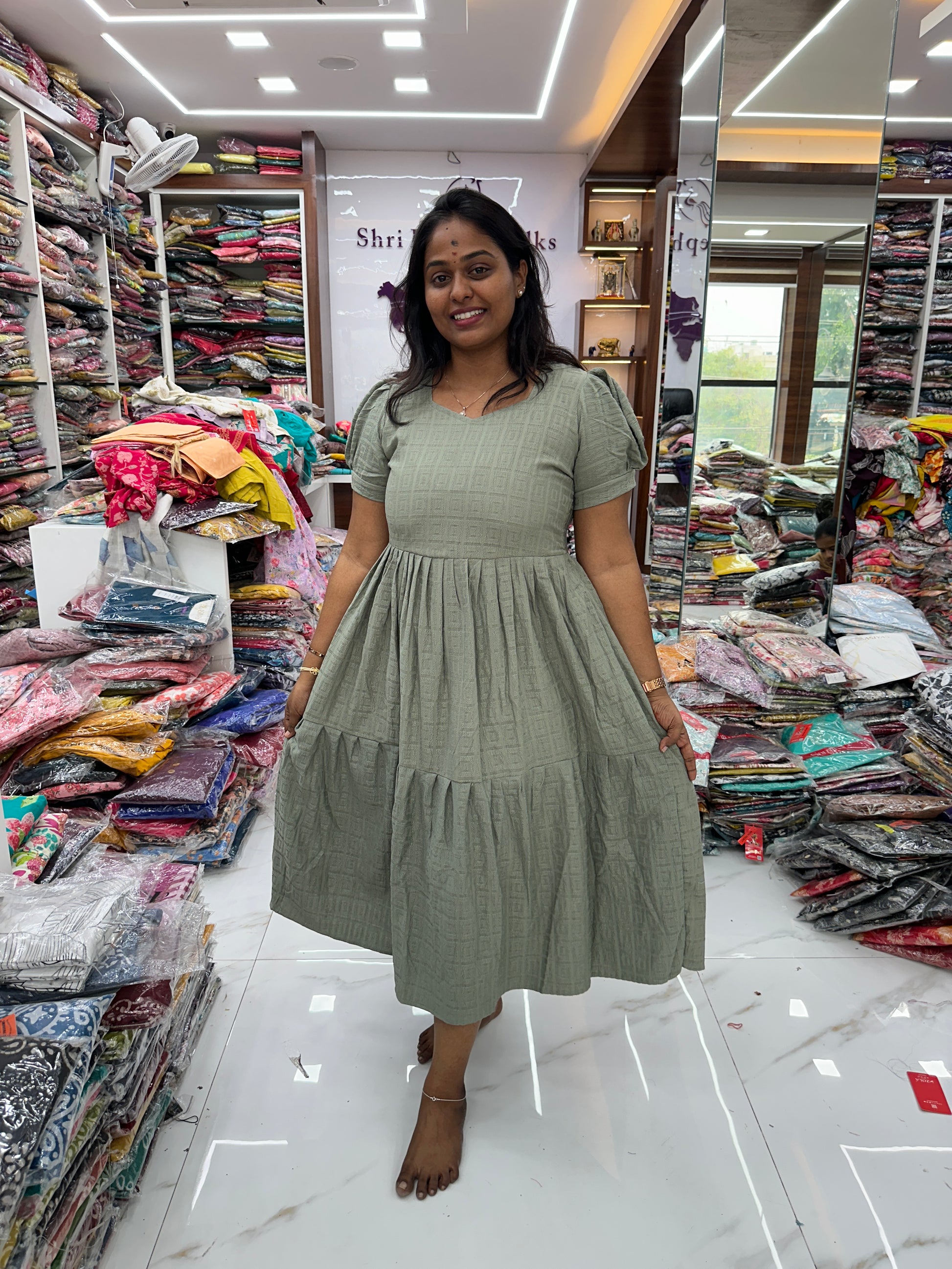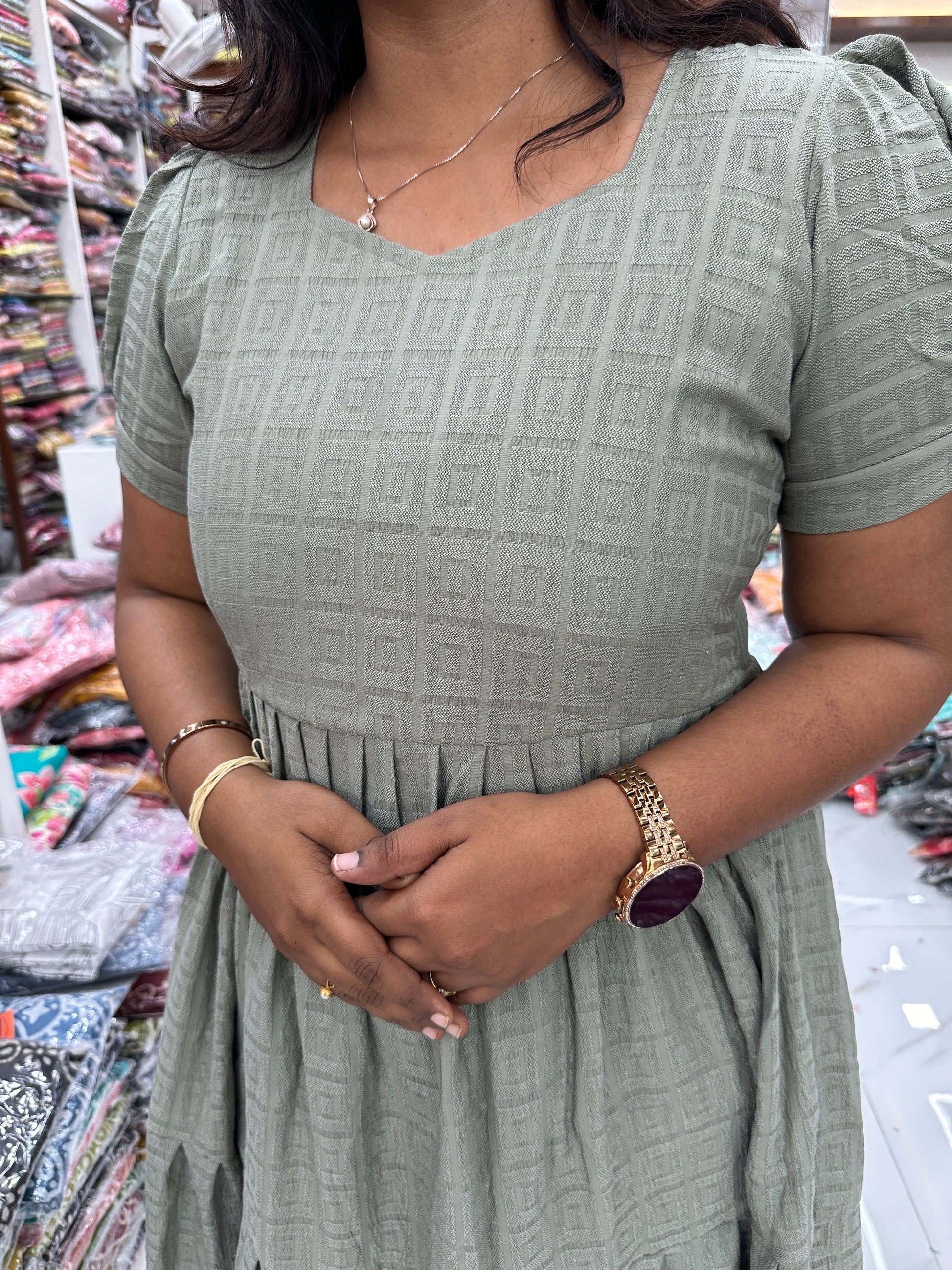 Square Pastel Olive Cotton Puff Midi dress
